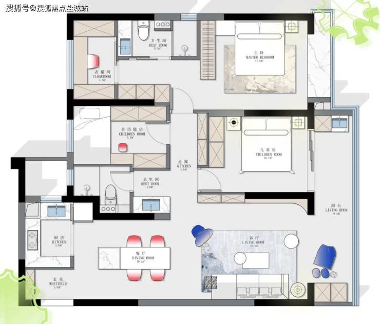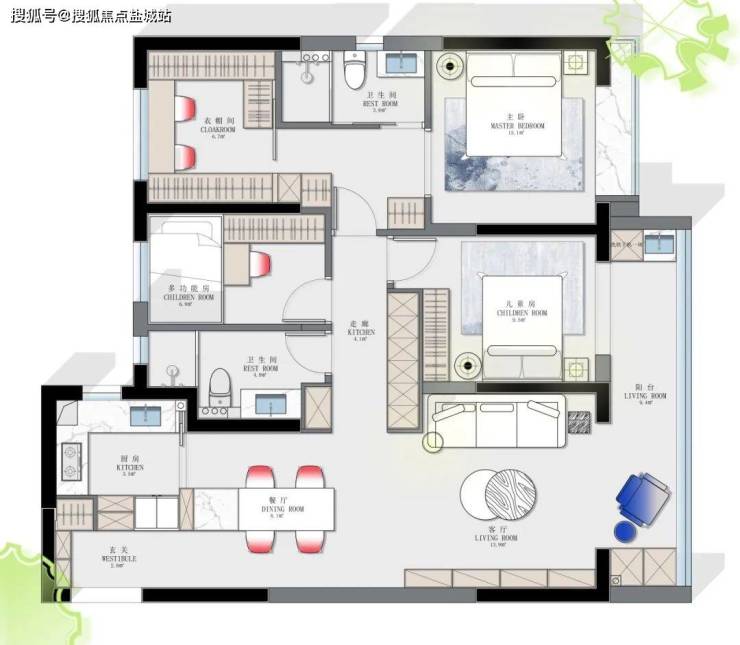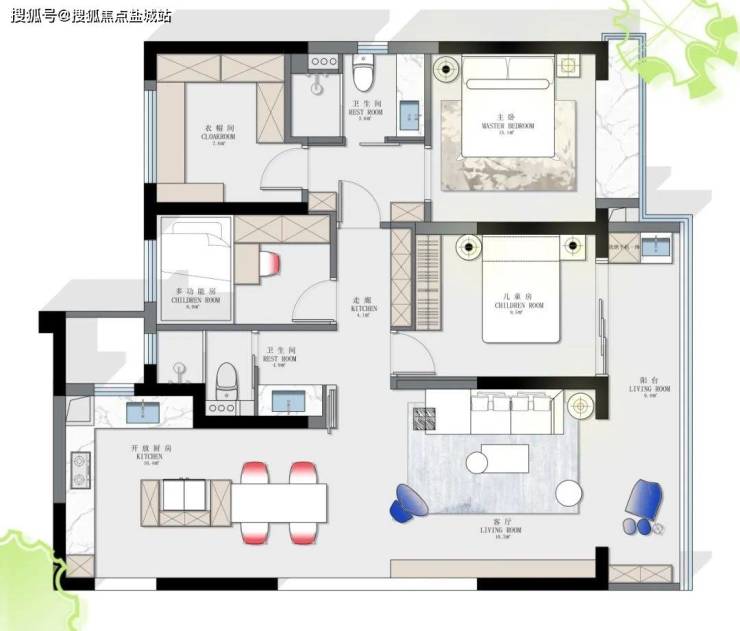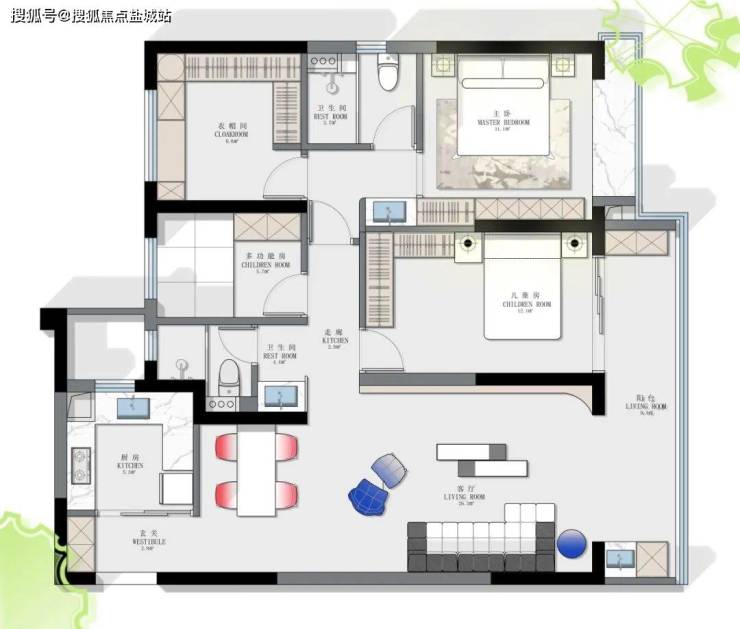南边儿童房开门位置对调, 整体空间的动和静区域绝对分开,主卧的大衣帽间,过道的超深超长储物柜等,满足日常物品的收纳。