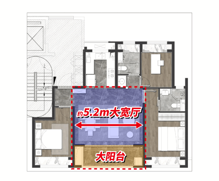 你敢信!项目建面约100㎡就能享受时下更受年轻人青睐的大横厅户型,厅宽达约5.2米,配上大尺度阳台,整个社交区域方正、阔绰,待客、休闲皆从容自在。