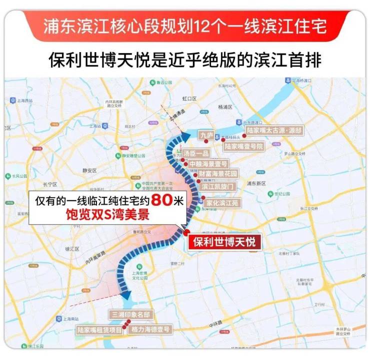 ①保利世博天悦是近乎绝版的滨江首排,直线距离黄浦江只有约80米,与江几乎“触手可及”