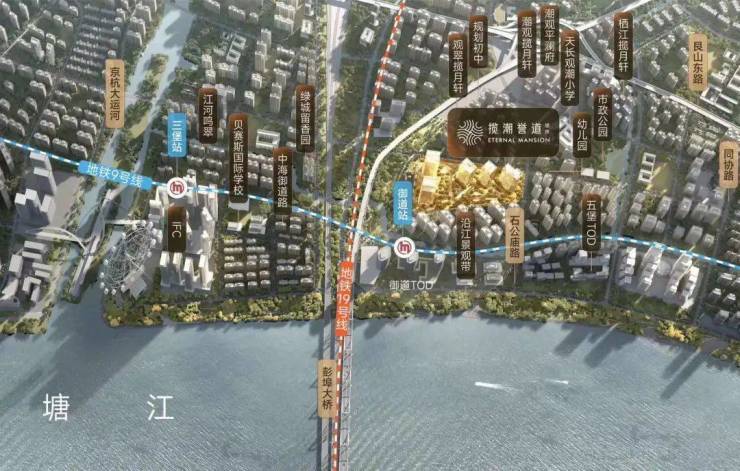 在IFC板块,一个江景大户型拔地而起——滨江·揽潮誉道。从揽潮誉道步行到IFC大约1500米,骑上小黄车差不多8分钟。当然更推荐的方式是地铁,下楼约100米乘地铁9号线坐1站,从三堡站直接进入IFC的地下层。