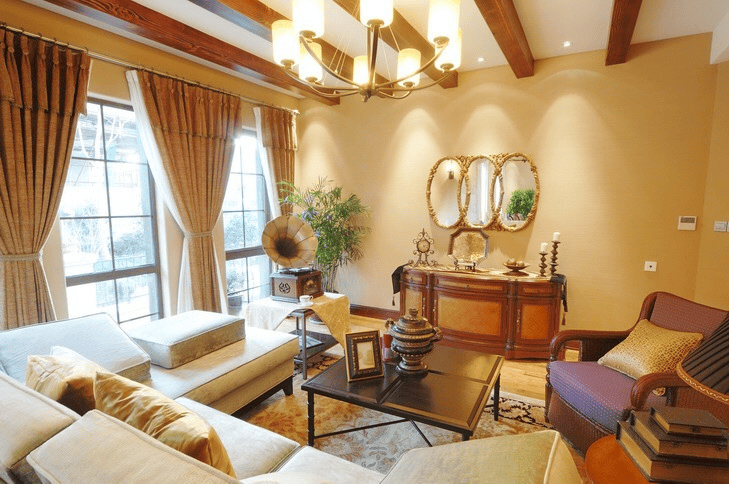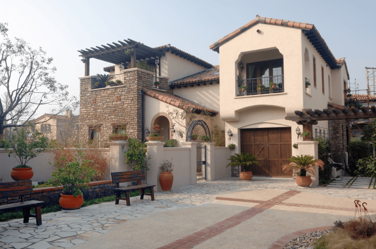 采用美国南加州的建筑风格,外立面采用淡黄色的手工Stucco抹灰外墙和红瓦屋顶,将原汁原味的南加州风格复制至此,同时融入原木、三色瓦片、红砖、铁艺、各式烟囱等元素,渗透一砖一瓦,仿佛置身异国小镇。