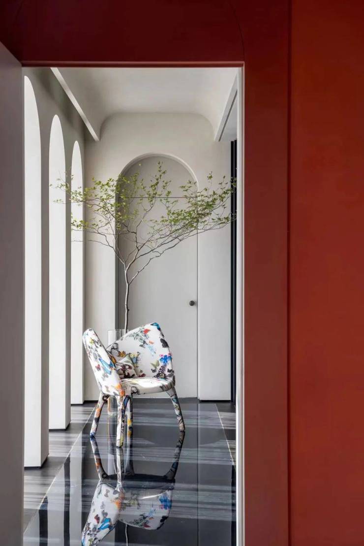 「无界空间」:客厅270度转角无柱设计,搭配落地玻璃,开阔视野将院中风景迎入日常。