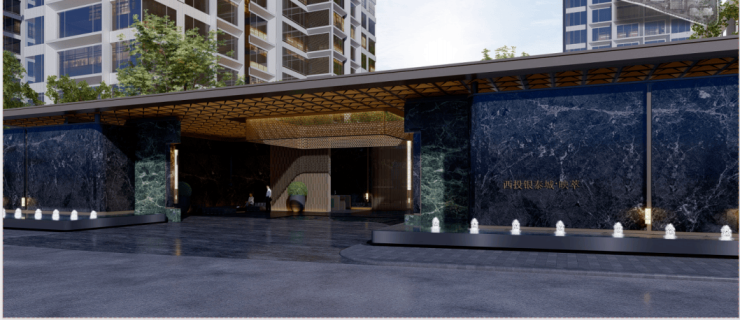建筑立面现代挺拔,采用全铝板贴面,符合高端办公和公寓的配置,在此基础上,改造内容包括:大堂出入口、增加楼栋首层泛会所、增加公共会所泳池、优化园区标志性主入口。主入口采用干挂芬迪黑石材、普拉达绿石材、古铜色铝板等进口材料,整体现代且华贵,灯光点缀,调性高雅,近人尺度细节丰富,打造豪华入口,提升尊贵体验感。