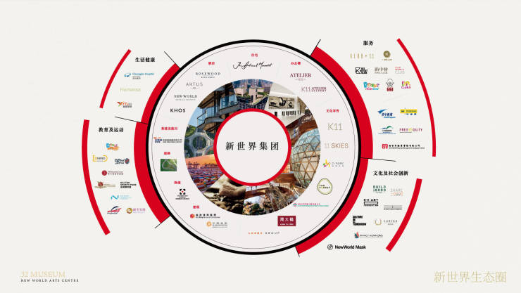 “艺、文、商、社”共融的发展形成融合多元业态的新世界生态圈,通过汇聚了多种业态服务,如住宅、教育、医养、保险、零售购物等,运用多元的创新力量,从基础生活支持提升到品质生活体验,让社会变得更美好。