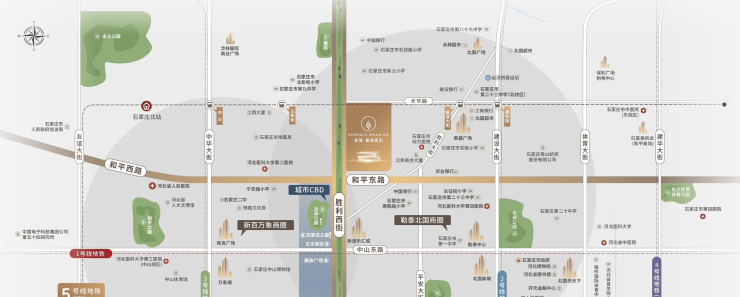 坐拥和平路、中山路,胜利西街、建设大街、中华大街两横三纵城市干道,雄踞地铁5号线(建设中)「解放大街」站点,近邻1、2、3号线站点,出行更加畅快便捷。