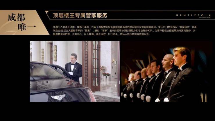 引入起源于法国,成熟于英国,代表了国际物业服务领域的最高境界的定制白金管家服务理念。望江名门物业特设“管家服务”为楼王业主配备专属管家,通过管家出众的现场协调处理能力和专业服务知识,为业主提供全面的解决方案和服务,并提供奢侈品护理、会务中心、私人宴请、出行助手、和私人旅行定制等增值服务。