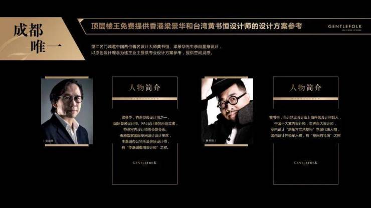 望江名门诚邀中国著名设计师黄书恒和梁景华先生亲自量身设计,以原创设计理念为楼王提供专业设计方案参考,提供空间灵感。