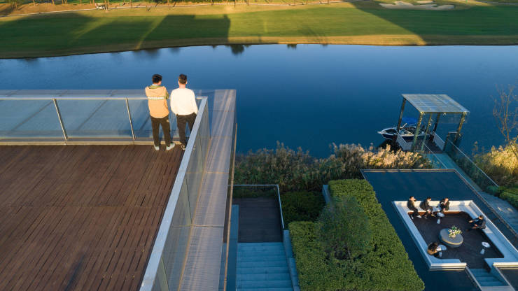 美兰天地私享城市风光,打造一方水岸秘境,更运用大面积玻璃墙体,打造无切割方正空间,3-5层玻璃建筑群落,以约0.4容积率散落湖畔,270°寰幕空间设计,置身其中,宛如驾御于果岭之上,是时代层峯人物理想的私人会馆。