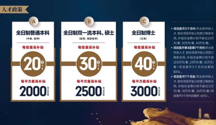 ✧ 全日制普通本科/中级、技师:补贴 2000元/平方米;最高补贴20万元/套。