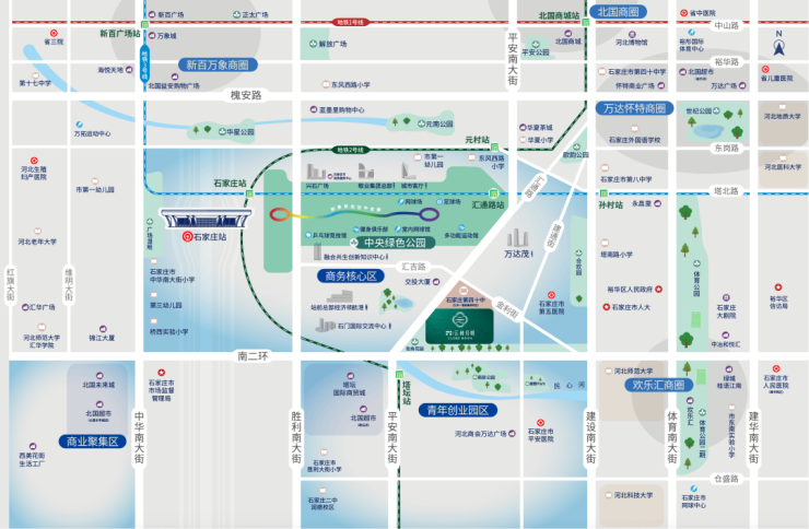 项目择址“高铁片区”,毗邻石家庄迈向国际化省会的发展“大动脉”,擘画着这座 “城市客厅”。纵横交通,咫尺高铁站,紧邻地铁2号线塔坛站、3号线汇通路站,擎动地铁生活圈的便捷与活力。
