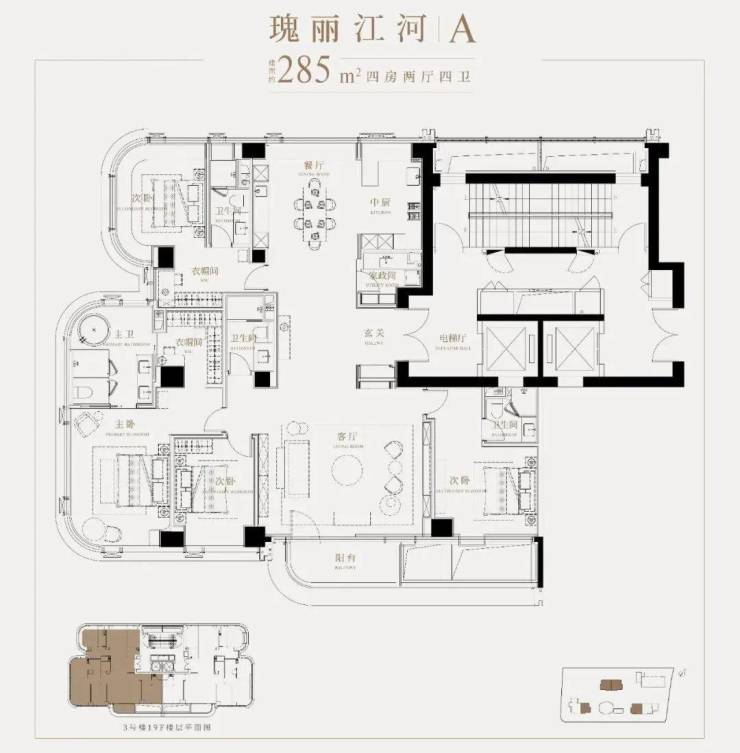 主力户型285㎡,设计融入了两梯两户尊贵配置,配备独立入户电梯厅,营造一步到位的豪宅氛围。入门即享玄关与独立储物间,尊崇体验从踏入家门的那一刻起。