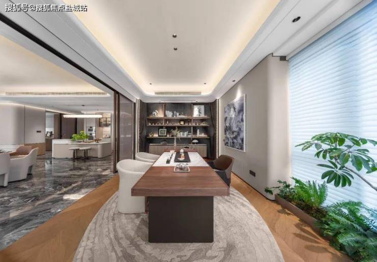 在茶室,设计师选用木美MaxMarko品牌,中式圈椅造型美学辅以天然皮革材质,温润的大理石结合古韵实木,古朴典雅又符合现代美学,在不同材质的碰撞中,探讨当代茶与生活方式的融合。一抹绿意伸展,袅袅烟影落于晴窗,私藏一隅东方雅韵,阅尽书籍的历史厚重感,在茶香与墨香中沉淀生命诗意。