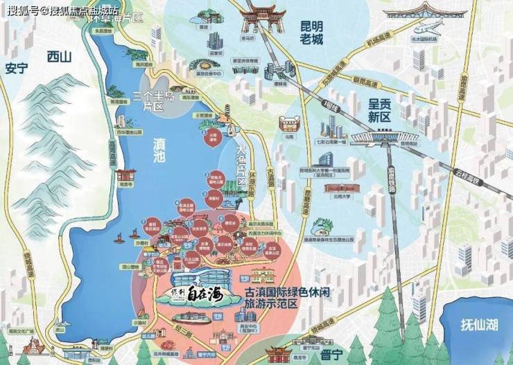 保利·自在海距滇池直线距离约2公里,建面约254万方全配套住假大城,集旅居、教育、康养、商业等多元业态为一体,北邻滇池以及七彩云南欢乐世界,南临晋城版块中心,半径约3公里内辐射古滇全维度假休闲配套。