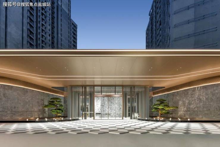 迎客区的标准:奢华背景墙+罗汉松造景。