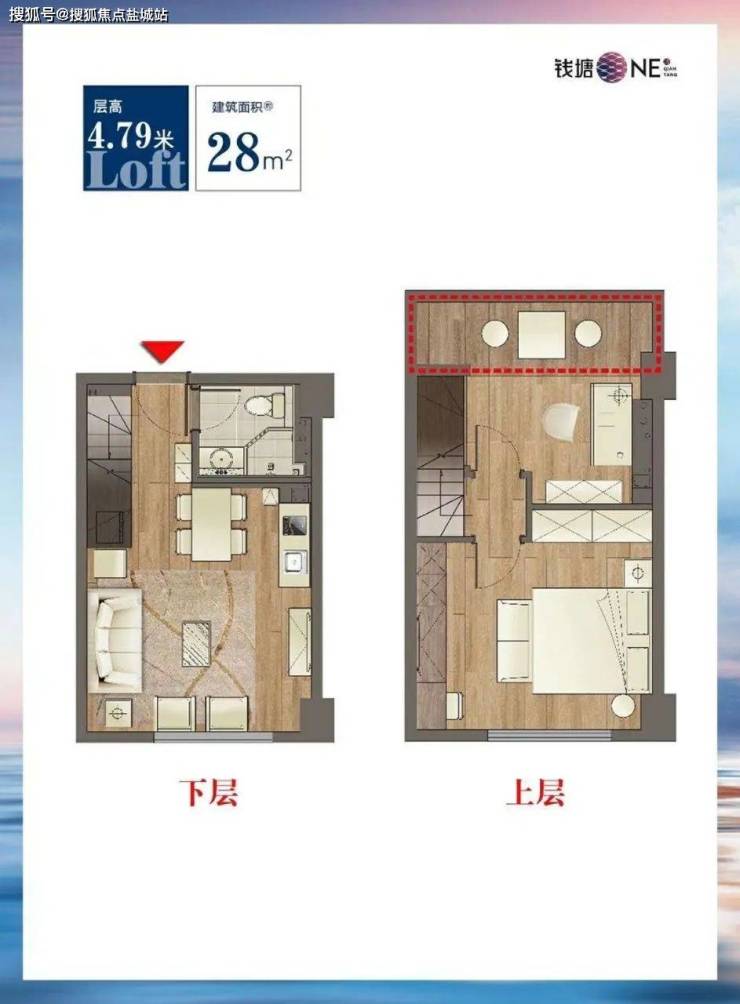 同是还有约28方户型,总价85万起!层高4.79米loft!生活却多了加倍的精彩。毕竟尺度感更足了!一个卫生间,此外还有独立的餐厅,生活的安排井井有条。会客厅、卧室等的尺度也都放大了,使用起来更从容。