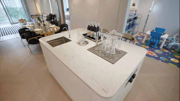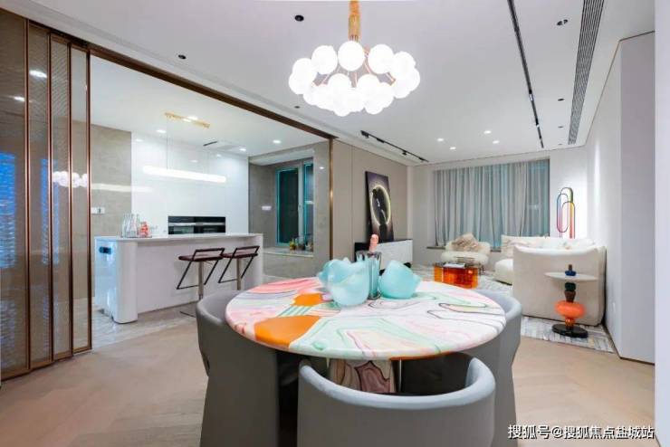 餐厅打造了一个圆弧形设计的岛台,增加储物空间,功能性更强。