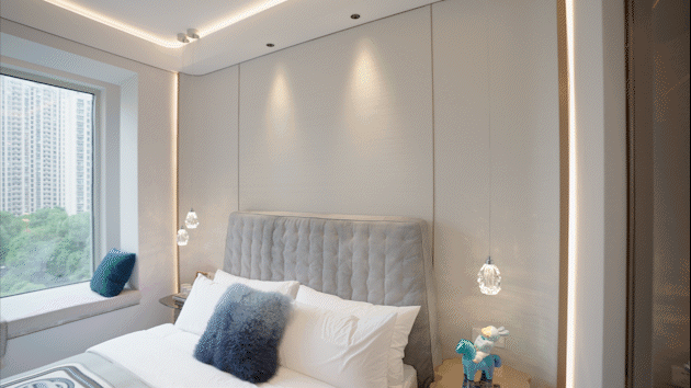 走进卧室,吊顶做了多层圆弧设计,床头背景隐藏灯带,再加上金属的包边,细节处显现豪宅的风格。
