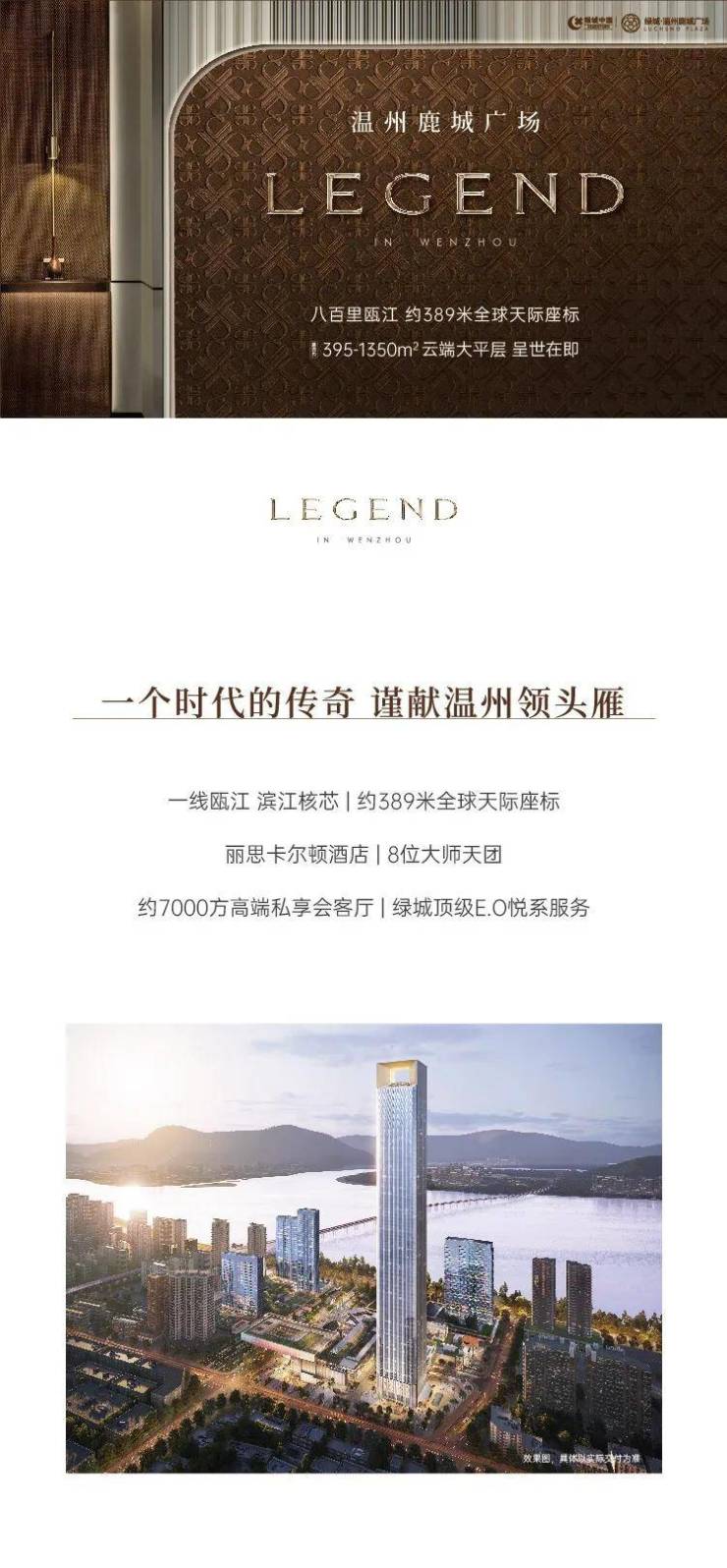温州鹿城广场约389米全球天际座标,如同纽约ONE57,构建温州的立体世界,聚合酒店、大平层、商业、城市广场等业态,在世界级多维场景连接下,激发城市无限想象,重构世界温州的江岸坐标。
