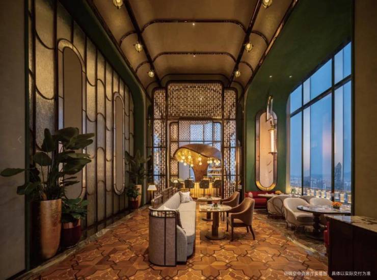·空中会客厅:屹立约160米高处,一线无遮挡,8米挑高空间,赋予会所I-MAX钜幕观景,配顶级中餐厅、多功能厅、雪茄吧、全日制餐厅、酒吧;