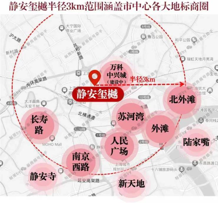 ✅ 约4公里辐射圈:外滩、南京西路、陆家嘴、人民广场、静安寺、北外滩六大CBD环伺 ✅ 约2公里醇熟生活圈:静安大悦城、苏河湾万象天地、凯德虹口商业中心(现享)+中兴城商业、合生汇(在建)双地标加持