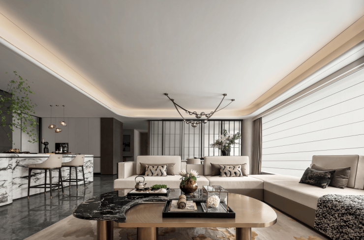 运用了大量石材,地面为“鱼肚灰”,形成大面留白。客厅背景墙与则使用“君子兰”,按照纹理延续进行拼接后,既似兰花又似泼墨山水,两者共同作用下,营造出一种中国山水画的意境。