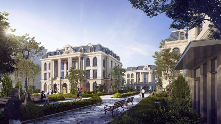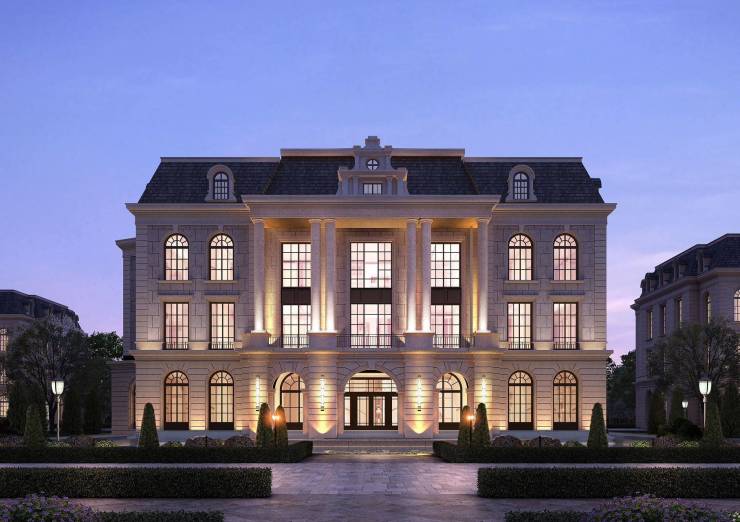 *法式平墅:单层面积397-686m²,均价2.5w元/m²,通燃气,入户有独立花园,共5层,得房率88%,一户一梯