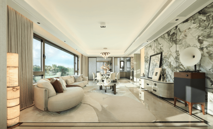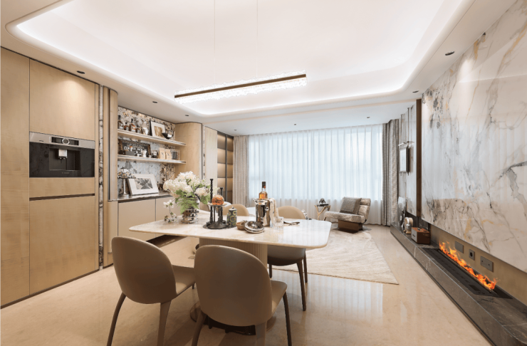 该户型客餐尺度达7.5米观景面,270°极致环幕窗景,最大化引景入室,百万方森态谧境成为私享级流动窗景。