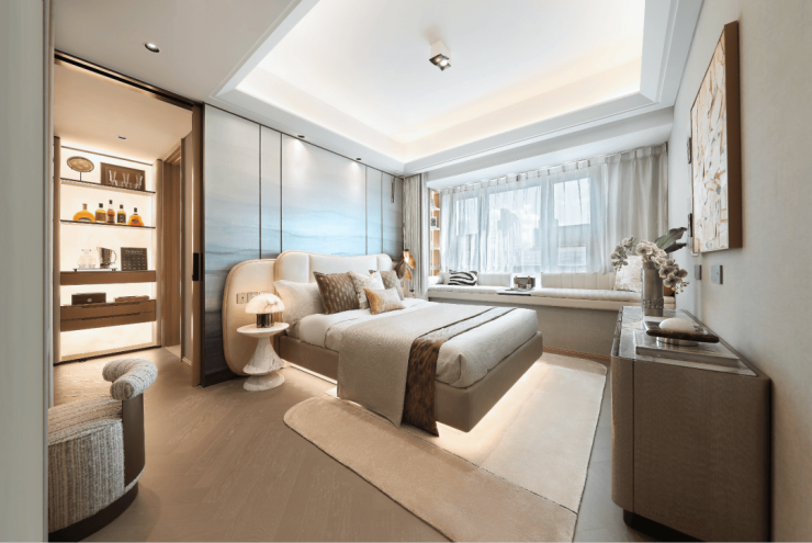 居住体验方面,该户型打造行政级主卧套房,带步入式衣帽间、私享卫浴及南向超阔飘窗。
