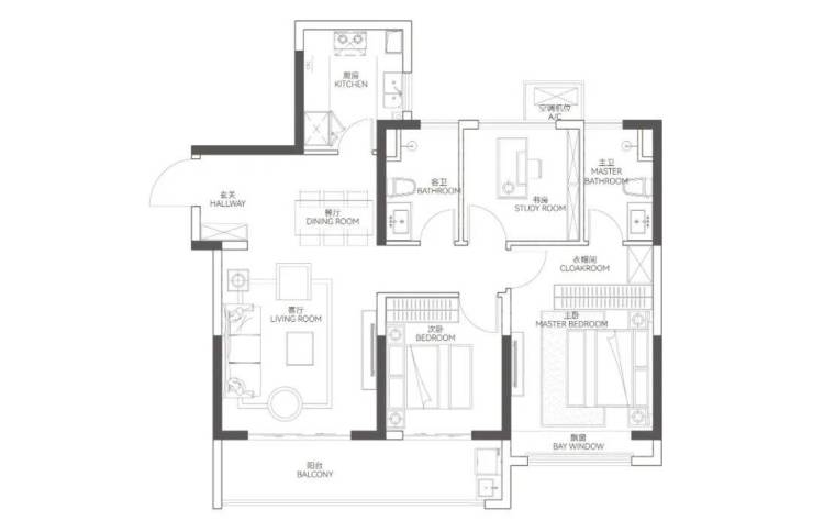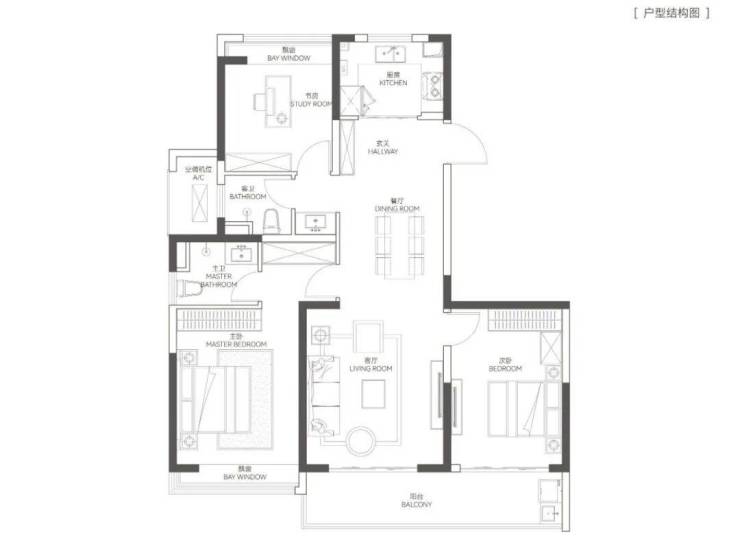 三开间的飞机户型,几乎没有过道空间浪费,约7米南向双阳台,把格局一下子打开。