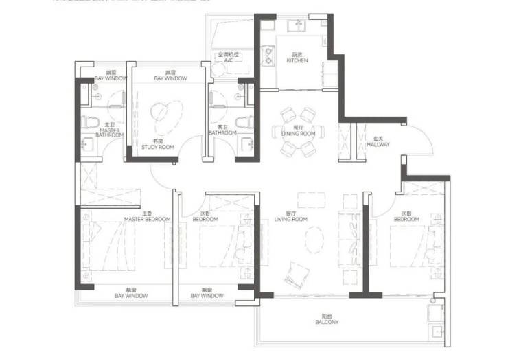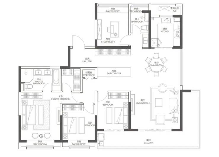 四开间朝南,南向双联阳台,2个南卧+书房+主卫均带飘窗,并且主卫面积非常大,体验感很强。