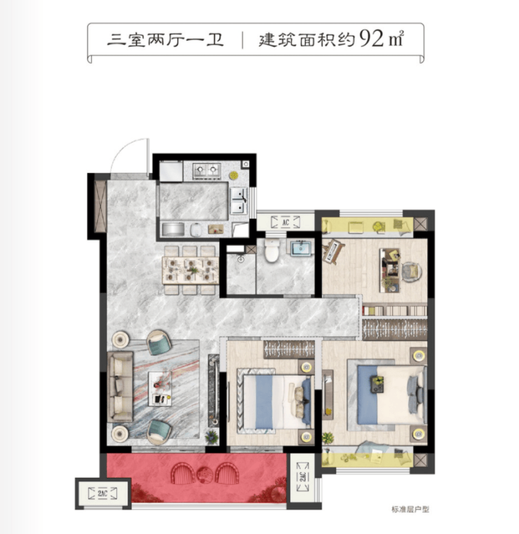 建面约92㎡的户型产品,三室两厅一卫的设计,三开间朝南,瞰景双阳台+南北双飘窗设计,室内采光通风效果俱佳,功能性齐全,是刚需上车的优质选择。