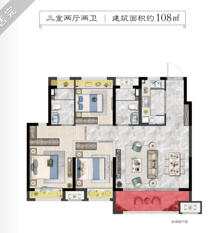 建面约108㎡的户型产品,三室两厅两卫的设计,相比建面约92㎡的户型产品又多了一个主卧独立卫生间,户型的私密性更强。