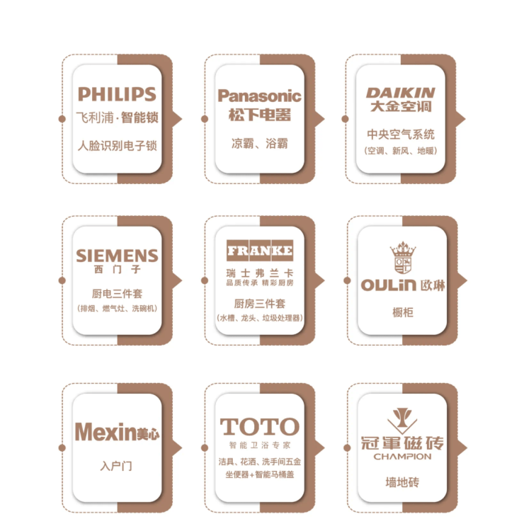 西门子洗碗机、燃气灶、吸油烟机的厨电三件套;松下凉霸;弗兰卡台盆、龙头及垃圾处理器;入户门选用美心牌钢木复合门、飞利浦智能人脸识别电子锁;