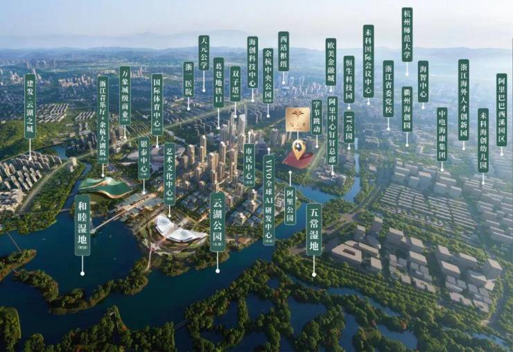 |万亩湿地:项目三面环水,南接阿里公园,直线距离约500米五常湿地及余杭中央公园(在建)环绕,坐拥超万亩湖岛水链体系,构筑半岛水岸奢宅。