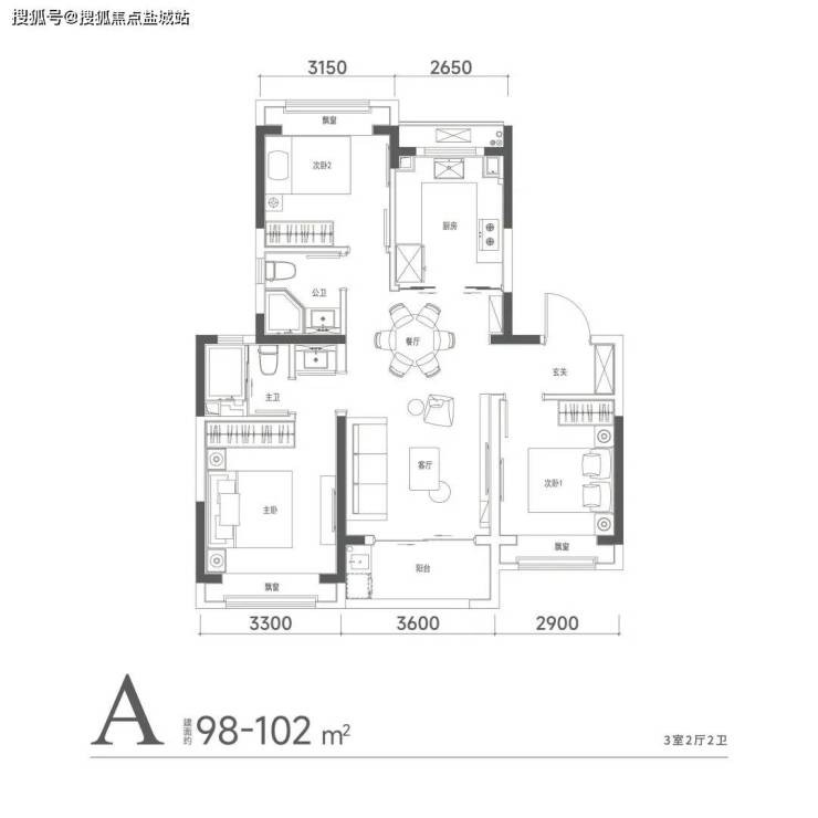 客厅横厅布局,面宽约6.2米;餐厅独立,宽度达3.25米,可放置多人就餐圆桌;南向三卧,双套房设计,主卧面宽约3.7米,带衣帽间、淋浴、浴缸。次房间宽也达3.3米;两个小房间开间也有3米和2.9米,都能放大床。另外,客厅连接约8㎡大阳台(不封阳台,算一半面积),整个社交区域方正、阔绰,待客、休闲皆从容自在。6个飘窗设置(不算面积)更很好延展了室内空间。在入户仪式感上,该户型还享独立电梯厅入户。