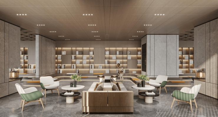 引入洲际酒店中轴对称的制式,打造约50米宽,6米高超奢阔尺度主入口,精选石材搭配铝型材线条,不凡仪式感彰显豪宅气派。