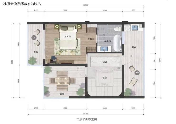 三层:尊崇主人层● 全功能主人层设计,10.7米大开间豪华套房布局,独享尊贵● 东西南3大环景露台,将大幕院景、阳光星辰尽收眼底,一境天地宽