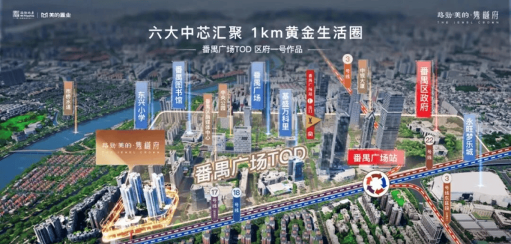 项目距离最近的地铁站3号线番禺广场站约800-900米左右,在这里有4条地铁交汇,分别为18-22-3号线,还有规划中的17号线,去珠江新城、琶洲都是直达过去。