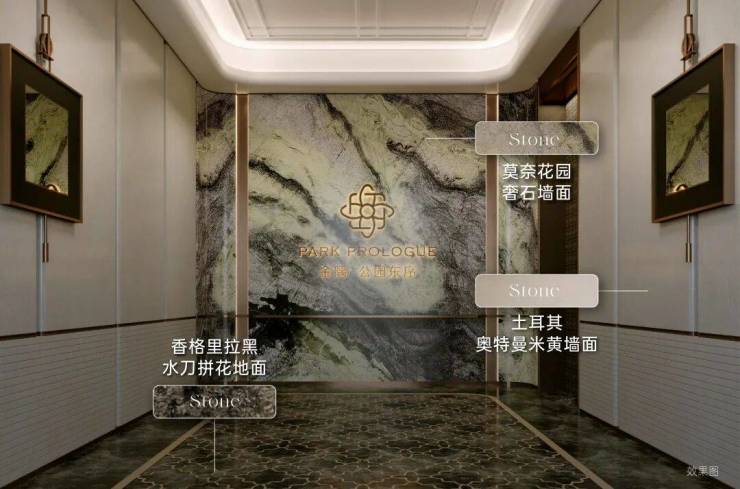 双归家精装大堂采用莫奈花园奢石、土耳其奥特曼米黄雕琢墙面,香格里拉黑水刀拼花铺就地板;
