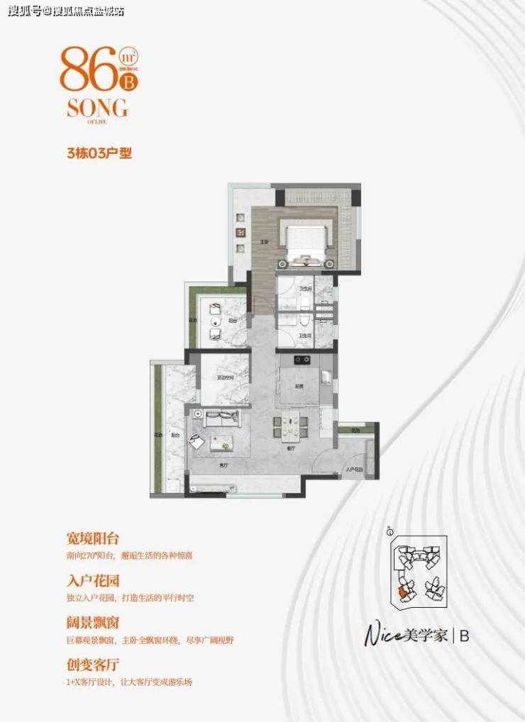▪南北对流 ,三开间朝南望中心花园,1+X客厅设计,客厅开间约3.8米