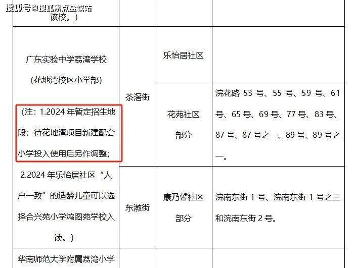 当然,今年省实的招生表上有个注明:“2024年暂定招生地段;待花地湾项目新建配套小学投入使用后另作调整”,即今年暂定这样,之后可能会有变动,所以具体还是要以当年的教育局招生计划为准。