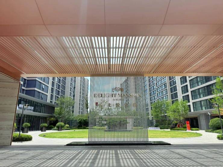 「古北悦公馆」建筑上采用简洁大气的现代风格,大面积玻璃与石材的拼接,外立面采用铝板+玻璃幕墙+局部干挂石材。