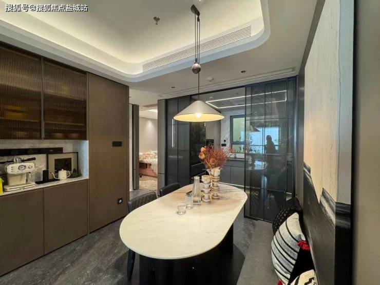 餐客厅是这个户型的一大亮点, 餐厅空间目前放的是4-6人长桌,小编现场估摸着放个一米左右的圆桌是可行的。这个餐边柜的开放格采用了鱼肚灰石材装饰也是交付标准之一。