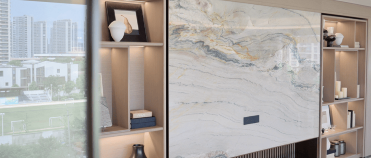 还有意大利木纹石的天然脉络、银灰石的冷冽光泽、迪加尔灰石的深邃层次,与巴西蓝水晶的星河般璀璨等进口奢石共同铺陈出空间的奢华底色。