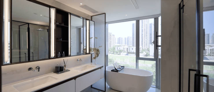 约6.6m宽的休息空间,约270°滨水景观,每天与朝霞一同醒来,梳妆台朝南,就着自然光化妆也会更美,主卫则是瑞士AXENT、唯宝、高仪,温暖的水流可以让疲劳一扫而尽。
