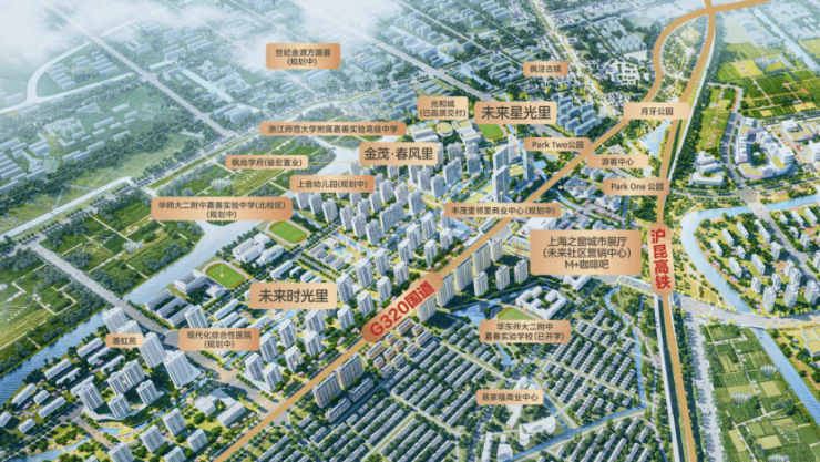 凭借紧邻上海的先天优势,依托“2高3轨2路”立体交通网络(G60沪昆高速、申嘉湖高速;上海示范区线、嘉兴至枫南市域铁路、南枫线;320国道、朱枫公路),实现与上海同城生活圈,美好践行“上海乐业,金茂安居”的都会理想。