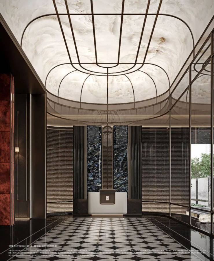 穿过华贵门廊,一境登门庭入府,超阔的接待前场是贝母形大理石地面铺贴纹路,头顶是透光云石弧形穹顶,正前方是皇室杈木影壁,接待台背部静置着“蓝翡翠”奢石背景屏风,以及与下沉水院一体的“三生石”造景,处处流露着优雅的艺术场域。