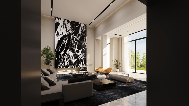 双首层入户一层,作为会客接待的私属领域,可归置约30人的客厅聚会,挑高私宴厅配置专业厨房,同时相连着阳光花园、泳池;入户二层,则构成家庭共鸣的流连忘返之所,客厅三面270°环绕落地玻璃窗延湖面延展,凭窗望湖,看山色自朝至暮缓缓移动,林间流莺婉转,阳光铺在水面上,泛着点点金光,水纹远远地向远处延伸,随之人们的心胸也豁然开朗.