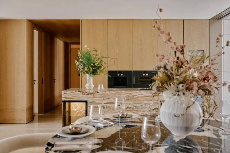 室内设计分别由MDO木君、CCD主笔,延续项目整体风格,以中性色调的木饰面、干净的线条、节制的装饰,塑造市中心大平层住宅的气度风华。