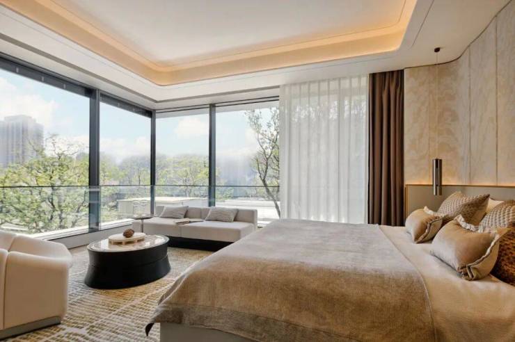 建面约245㎡的边厅户型,则在主卧留出了270°转角窗,在晨昏之间捕捉窗外美景与光影流动。